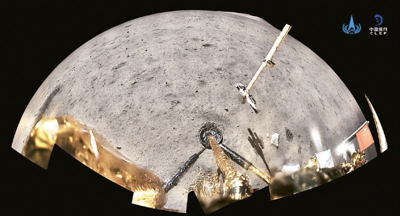 2020年12月4日,國家航天局公布了探月工程嫦娥五號探測器在月球表面國旗展示的照片。嫦娥五號著陸器和上升器組合體全景相機環拍成像,五星紅旗在月面成功展開,此外圖像上方可見已完成表取采樣的機械臂及采樣器。 新華社發(國家航天局供圖)
