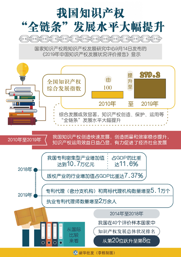 ——在完善法律法規方面,基本建立起符合國際通行規則、門類較為齊全的知識產權法律制度,實現了專利、商標、地理標志等知識產權的全方位、立體化保護。加入世貿組織以來,中國先后多次修訂專利法、商標法和著作權法等法律,基本形成了知識產權“嚴保護”的法律制度體系。